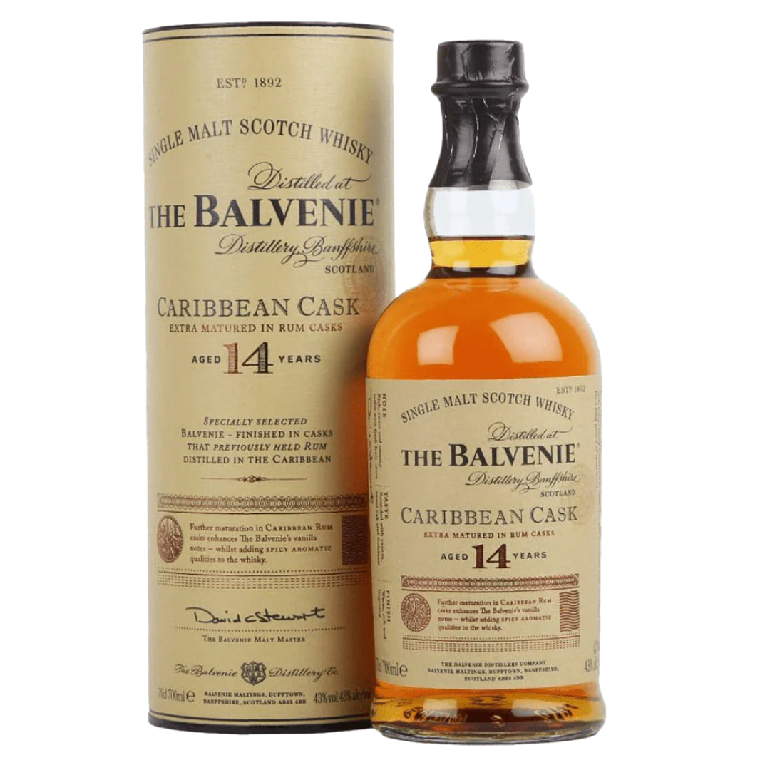 Balvenie 14 Year Old Caribbean Cask - This singlemalt scotch whisky is double barreled or finish in casks that were previously used to mature a Caribbean rum. This traditionally finished in port or sherry casks, only a select handful of whiskies are finished in rum casks, as they impart more tropical flavors to whisky as compared to wine casks, and contribute to a more unique flavor profile and aged in traditional oak casks for a minimum of fourteen years.