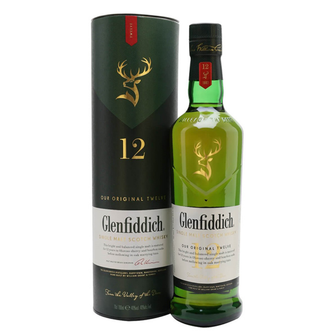 Glenfiddich 12 Year Old - This singlemalt Scotch whisky is carefully matured in the finest American oak and European oak sherry cask for at least 12 years. Glenfiddich 12 YO's well-known triangular bottle is one of the worlds most love selling malts. This classic Speyside single malt Scotch whisky from Glenfiddich was the Winner of a Gold Medal at the 2007 International Wine and Spirit Competition.