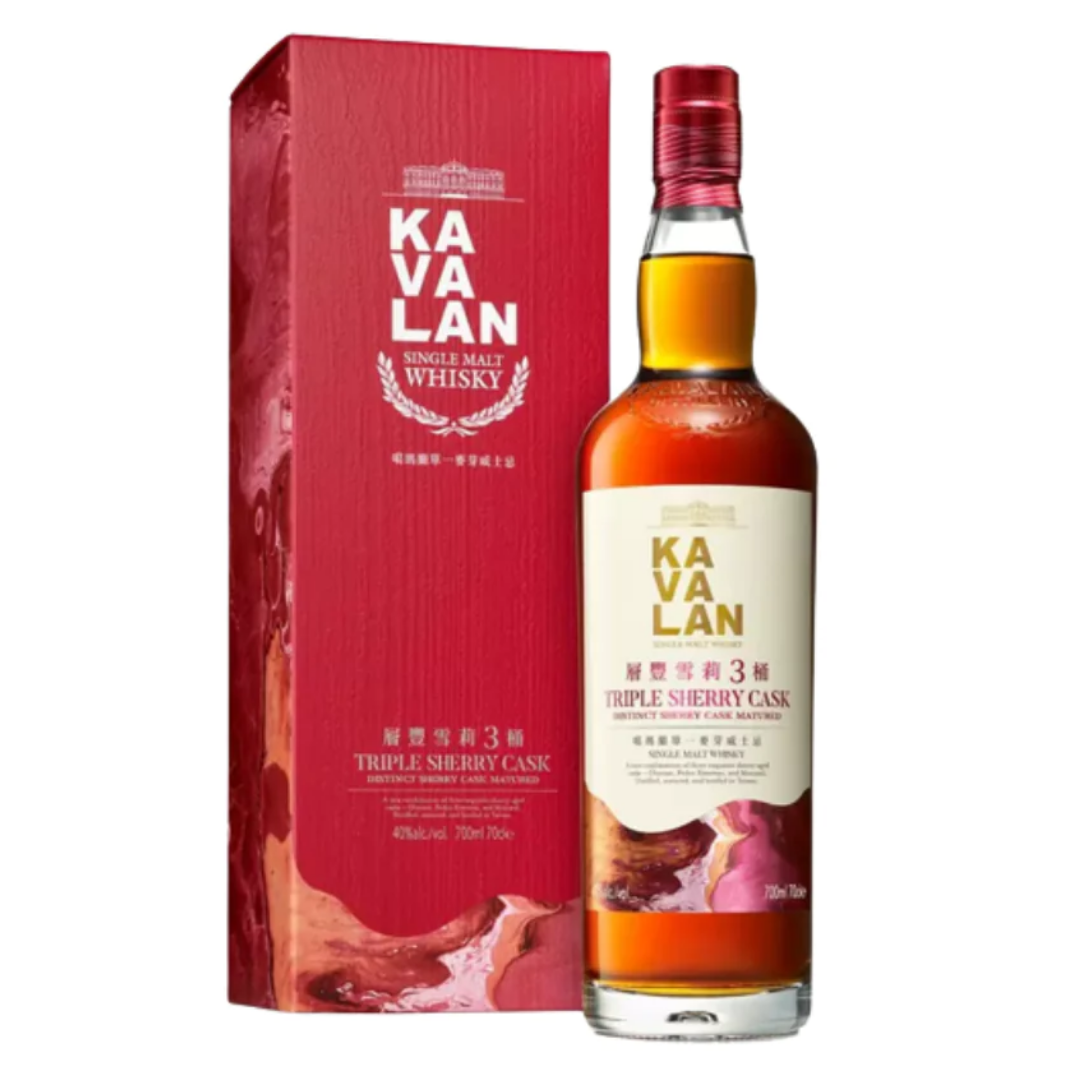 Kavalan Triple Sherry Cask - A rare Taiwanese singlemalt whisky from Kavalan Distillery that has been matured in a combination of oloroso, Pedro Ximenex and Moscatel sherry casks, adding layers of dried fruit and nuts to Kavalan's classic tropical character. Triple Sherry Cask showcases a three-stage balancing craft in the marrying vats. The process allows the three whiskies, each fully matured in the three different sherry casks to rest and meld together in perfect fusion, locking in optimal smoothness.