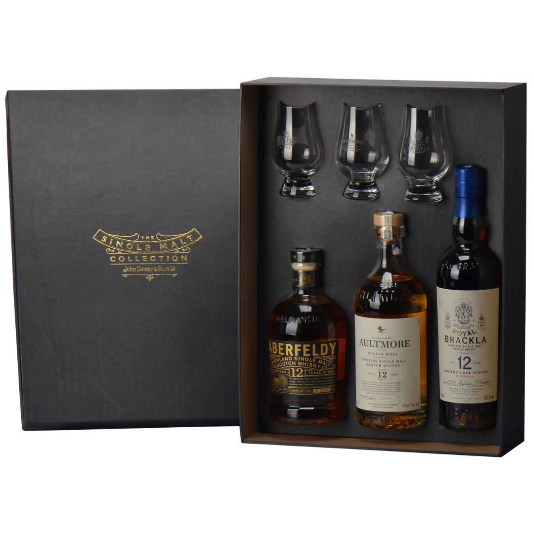 The Singlemalt Collection includes Aberfeldy 12YO 750ml, Aultmore 12YO 700ml, and Royal Brackla 12YO 700ml with three unique nosing glasses.