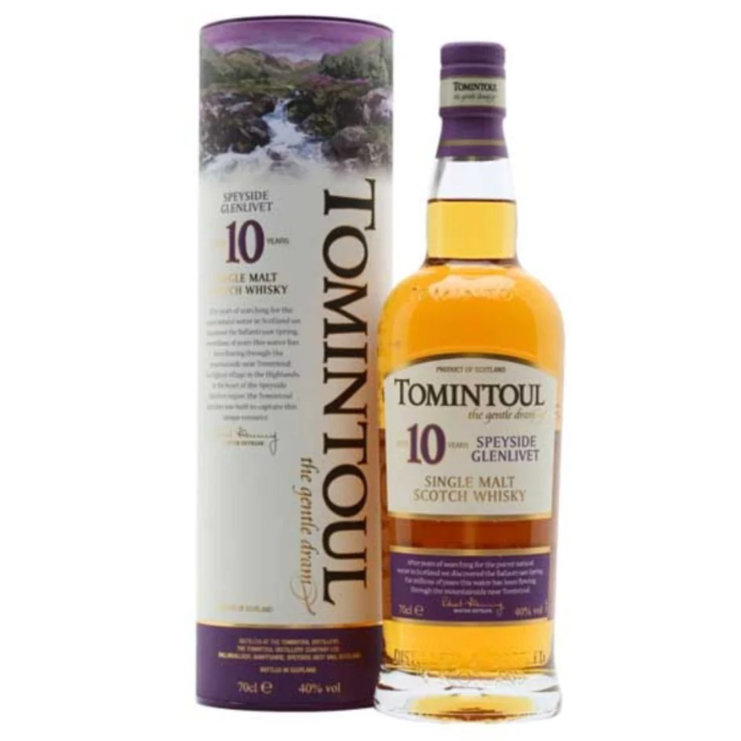 Tomintoul 10 year old - This Singlemalt from Tomintoul-Glenlivet Distillery located in Speyside region was introduced to their core range in 2002 and has been owned, operated by Angus Dundee Distillers. This whisky has been named after the highest village in the Highlands of Scotland, the nearby village of Tomintoul.