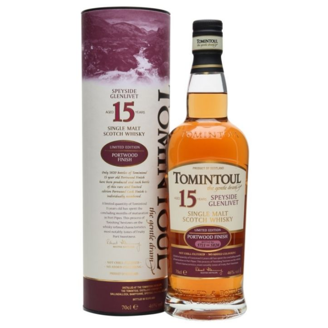 Tomintoul 15YO - 这款来自 Tomintoul 酿酒厂的苏格兰斯佩塞单一麦芽威士忌在特殊的波特伍德木桶中陈酿了很长一段时间,以展现其甜美的特性。